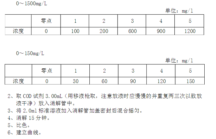 0~1500mg/L高量程在600nm±20nm波長處測量均可;但固定在一個波長。 0~150mg/L低量程在440nm處測量,均做空白。 二、曲線: